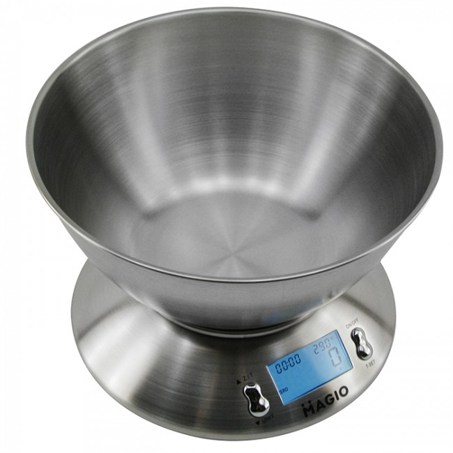 Компактні електронні кухонні ваги MG-695 від компанії Magio з максимальним навантаженням до 5 кг оснащені місткою чашею з нержавіючої сталі.